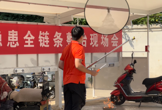 演练正式启动前,风火轮武汉大区总监陈照勇率先集结全体参与者开展 “安全科普课堂”。他结合近年典型案例,深入解析锂电池火灾的三大核心危害:燃烧速度快、瞬间释放有毒浓烟、易复燃,同时直击日常使用痛点,强调 “严禁入户充电、避免过度充电、远离高温环境”等关键禁忌,为后续实战演练筑牢理论基础。