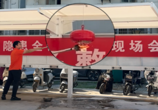 “点火!” 随着现场指令下达,工作人员通过煤油模拟锂电池热失控起火,火焰瞬间燃起。就在火光出现的3秒内,风火轮 AI 数智充电站即刻启动 “全自动应急响应”:AI 视觉系统精准锁定火情,同步向后台监控中心上传警报;充电面板自动断电,切断火势蔓延的电力源头;喷淋装置精准对准着火点启动扑救,警戒线同步升起隔离危险区域。从识别到处置,全流程无需人工干预,展现了智能设备应对突发火情的 “极速反应力”。
