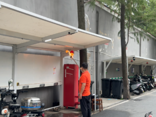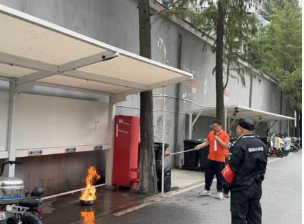 风火轮工作人员对风火轮AI数智充电站的设施、监控及灭火器进行了全面检查,确保设备完好。因锂电池加热不确定起火时间,同时为了避免废旧锂电池发生爆燃情况,现场模拟电动自行车充电起火。工作人员通过煤油点火,瞬间火焰窜出,触发报警系统。
