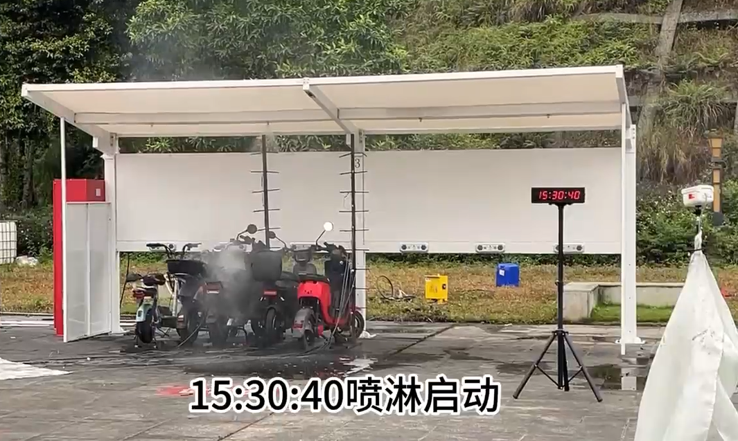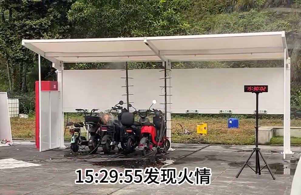 风火轮AI电动自行车充电站在本次试验中展现了卓越的早期干预与风险控制能力。系统在火情发生后的45秒内完成了从识别到启动喷淋的全自动响应:于15:29:55精准识别火情,随即在15:30:40启动喷淋系统,通过物理降温和阳燃防护快速压制初期火势。5分钟后,消防员抵达现场开展后续处置。最终仅造成1辆电动自行车受损,未蔓延至其他车辆,试验效果得到了专家们的认可,也有效验证了该技术消防安全领域的实用性与可靠性。