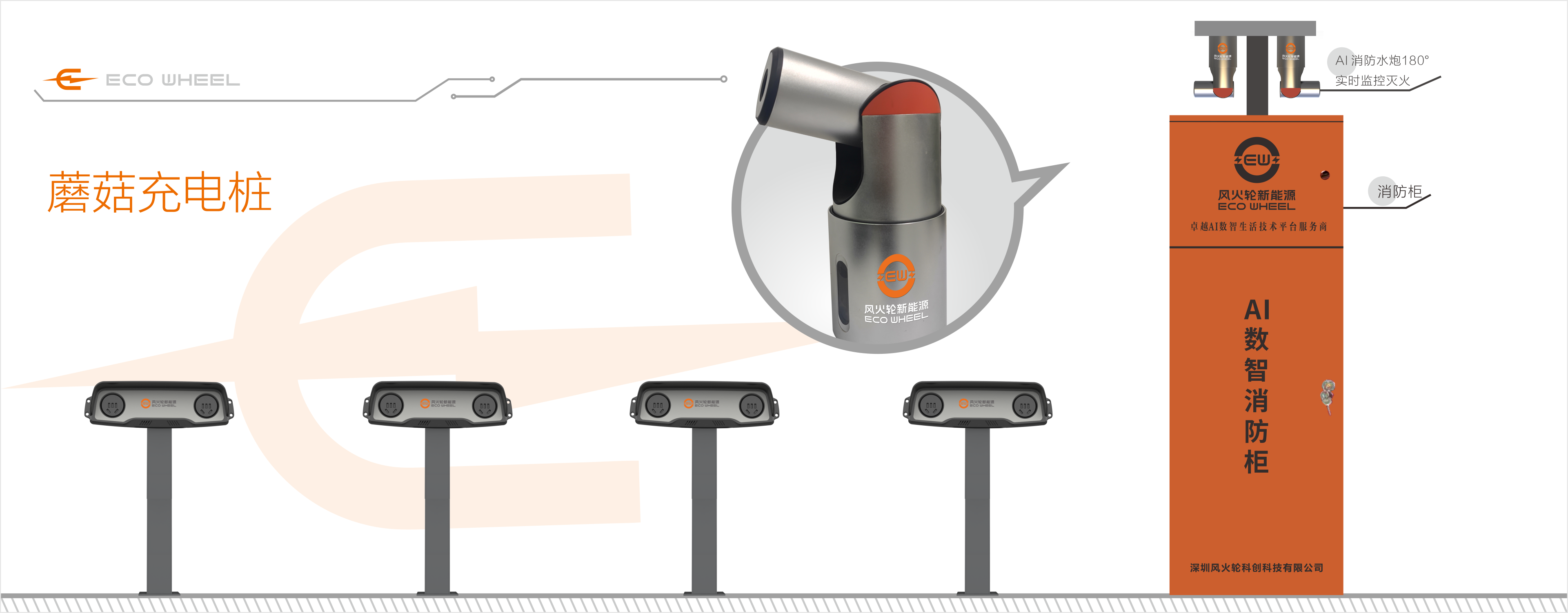 风火轮蘑菇充电桩配置24小时全天候运行的AI消防水炮,其具备覆盖180°的实时监控与自动灭火双重功能,可形成全天候、全时段、无间断的消防安全防护闭环。